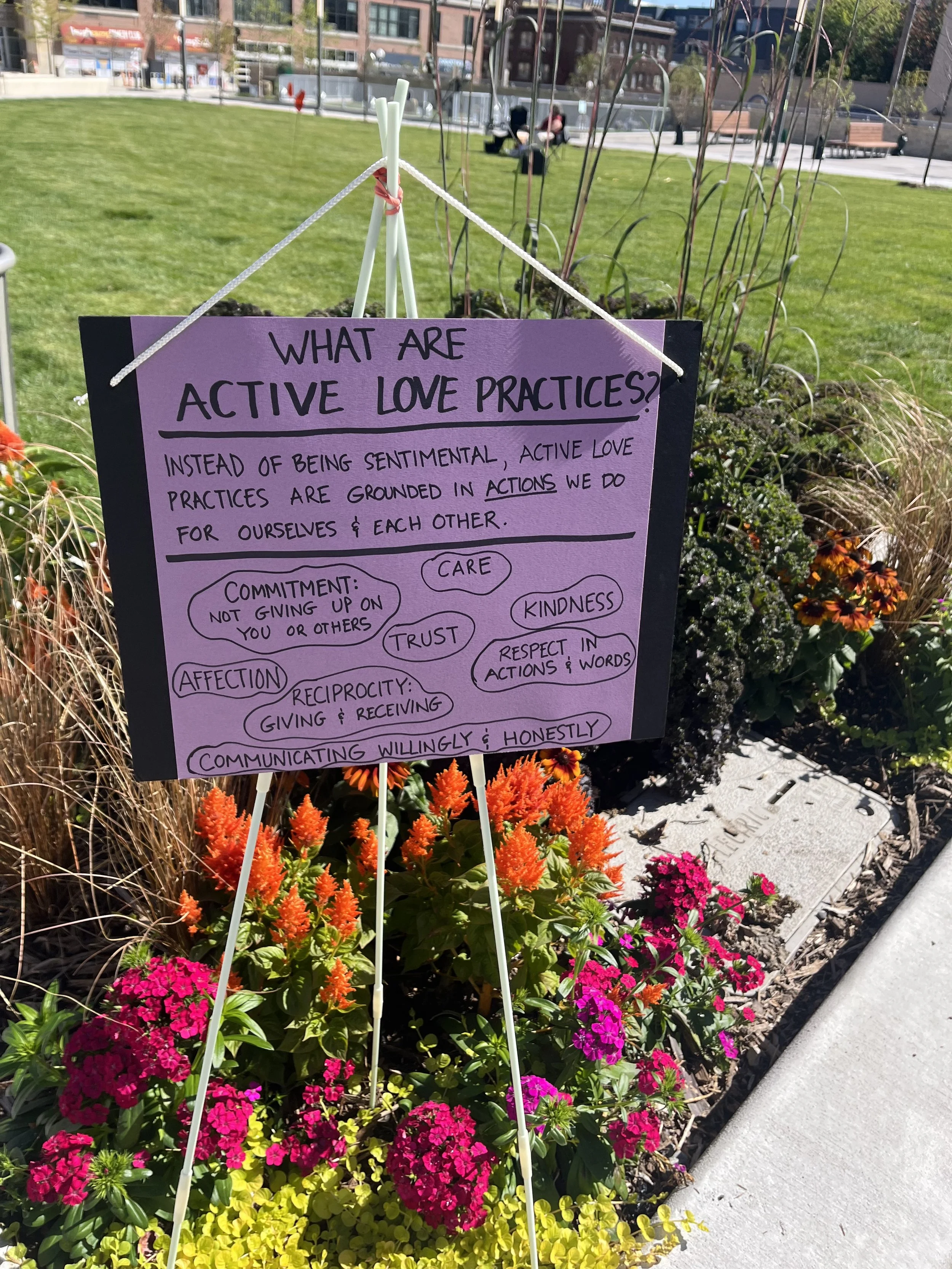 This sign reads: What are active love practices? Instead of being sentimental, active love practices are grounded in actions we do for ourselves and each other. Below, in wavy circles, I selected eight active love practices to highlight: Commitment- not giving up on you or others; Care; Trust; Kindness; Respect in actions and words; Affection; Reciprocity- giving and receiving; and Communicating willingly and honestly.