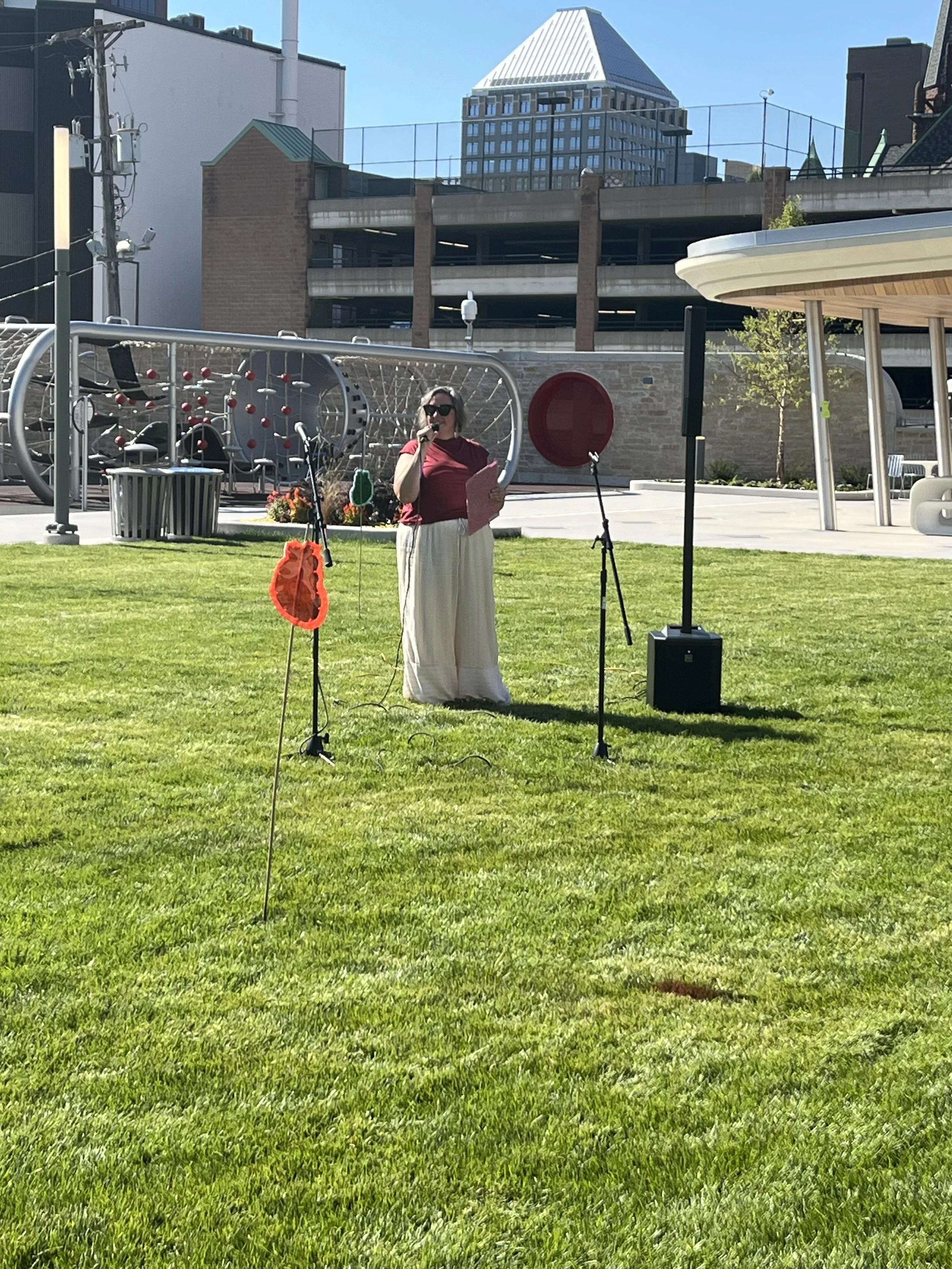 The day was bright and sunny with lovely weather in the mid-high 70 degrees Fahrenheit. The newly-created park’s grass was bright green and the flowerbeds, which I later learned were tended by residents of downtown who lived nearby, were lovely with various shades of purple, orange, pink, reds and greens shining in the foliage. There were a few people already in the park enjoying the day. A worker rode up on a utility vehicle bearing the speaker setup for our audio; we chatted as they set up the PA equipment, connected the power and tested the Bluetooth connection. A short while later as I began setting up my sculpture, several people came over to ask if there was an event today. When I told them of the Love Activation, they expressed wishes that they could attend and everyone who chatted with me said it sounded like a really wonderful event.