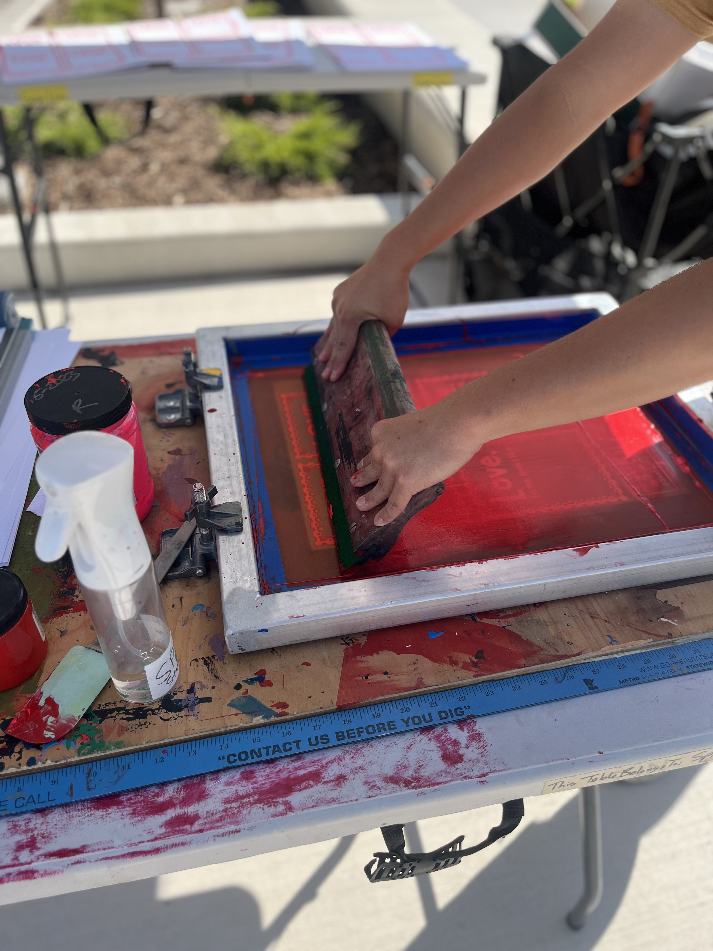 Sean cranked out lots of postcard pages, and allowed participants to also practice doing a screenprint! At right, Sean’s arms and hands draw the printing squeegee tool across a page that is below the screen, which is covered in red ink.