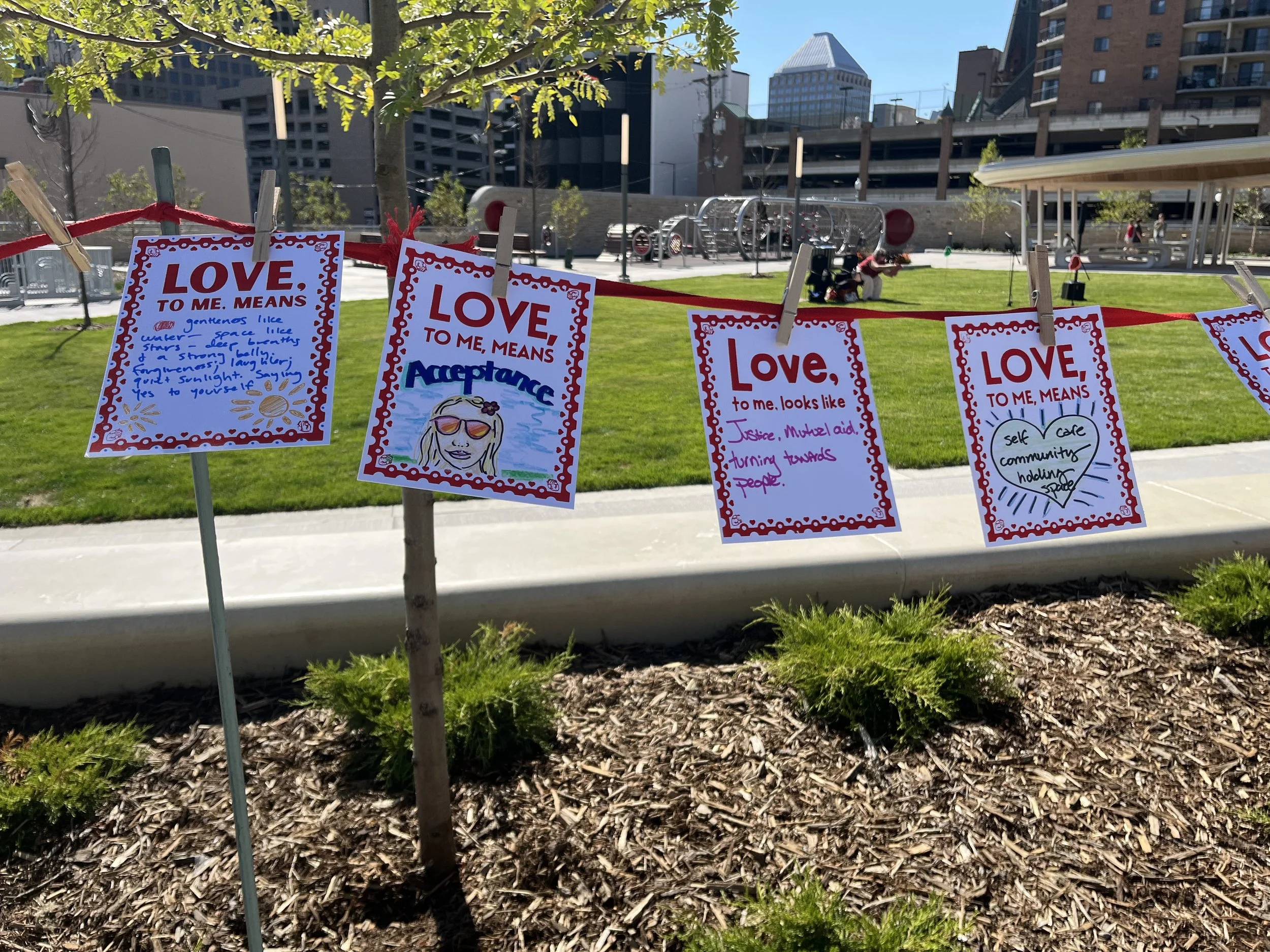 There were four love stations with handmade signage reflecting on active love practices and sharing affirmative statements about love.