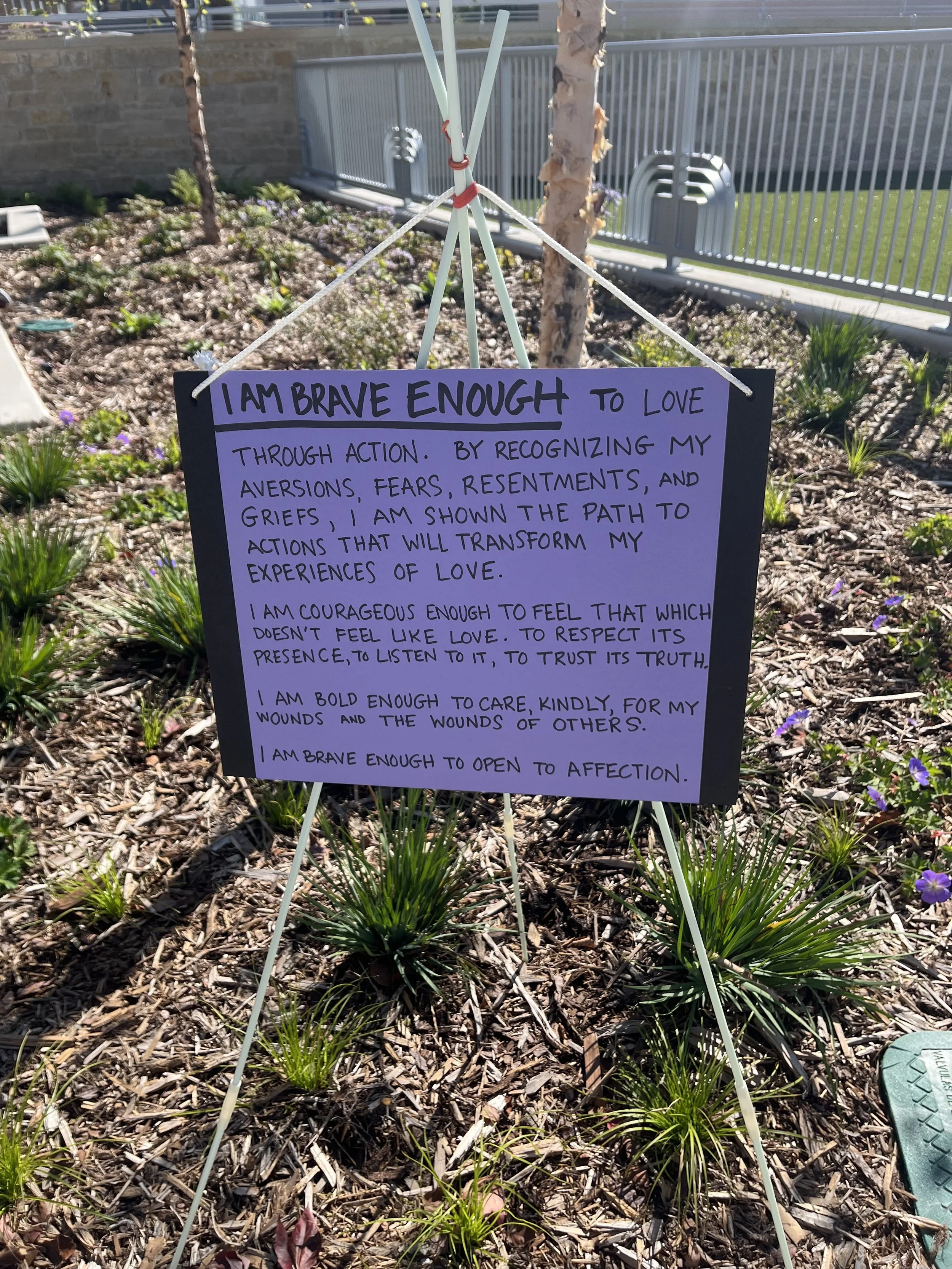 The sign reads: I am brave enough to love through action. By recognizing my aversions, fears, resentments and griefs, I am shown the path to actions that will transform my experiences of Love. I am courageous enough to feel that which doesn’t feel like love. To respect its presence, to listen to it, to trust its truth. I am bold enough to care kindly for my wounds and the wounds of others. I am brave enough to open to affection.