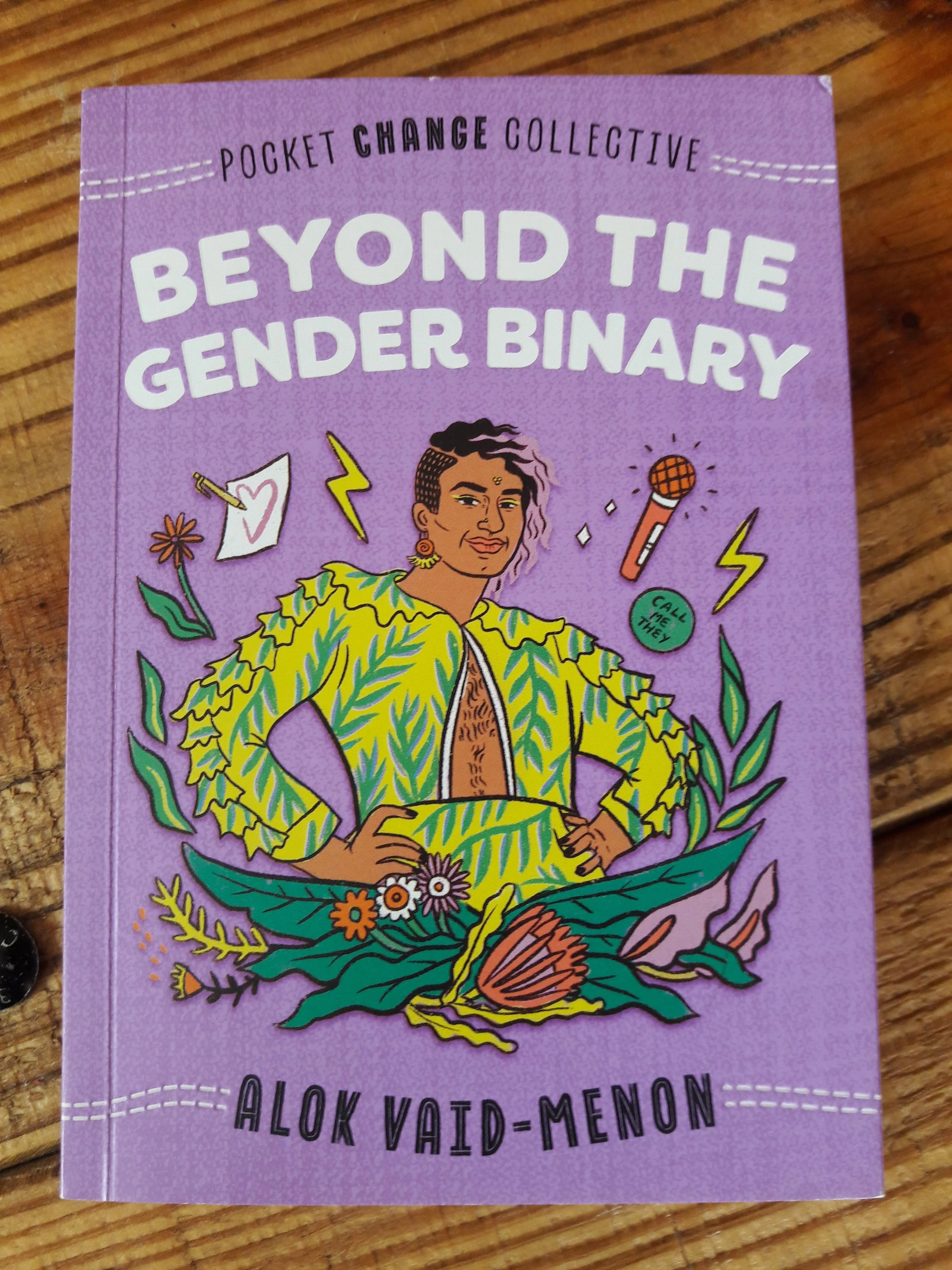 Beyond the Gender Binary book cover with a purple cover, a trans-fabulous person illustration - they are dressed in yellow green and black and surrounded by foliage, a lightning bolt, microphone, and pen and paper. The words Alok Vaid-Menon run across the bottom.