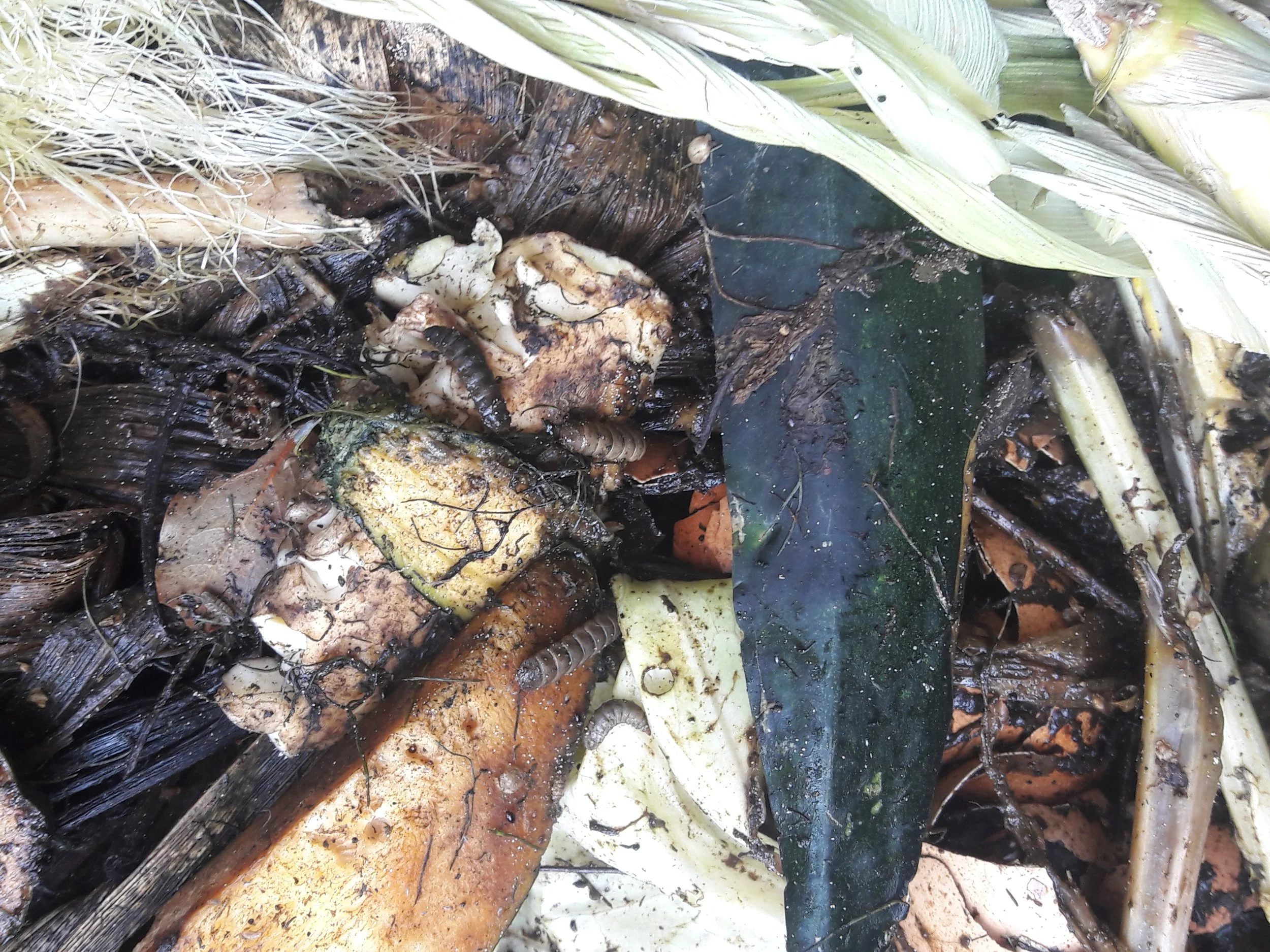 My compost heap in action, complete with creatures decomposing the vegetable scraps, egg shells, and organic matter.