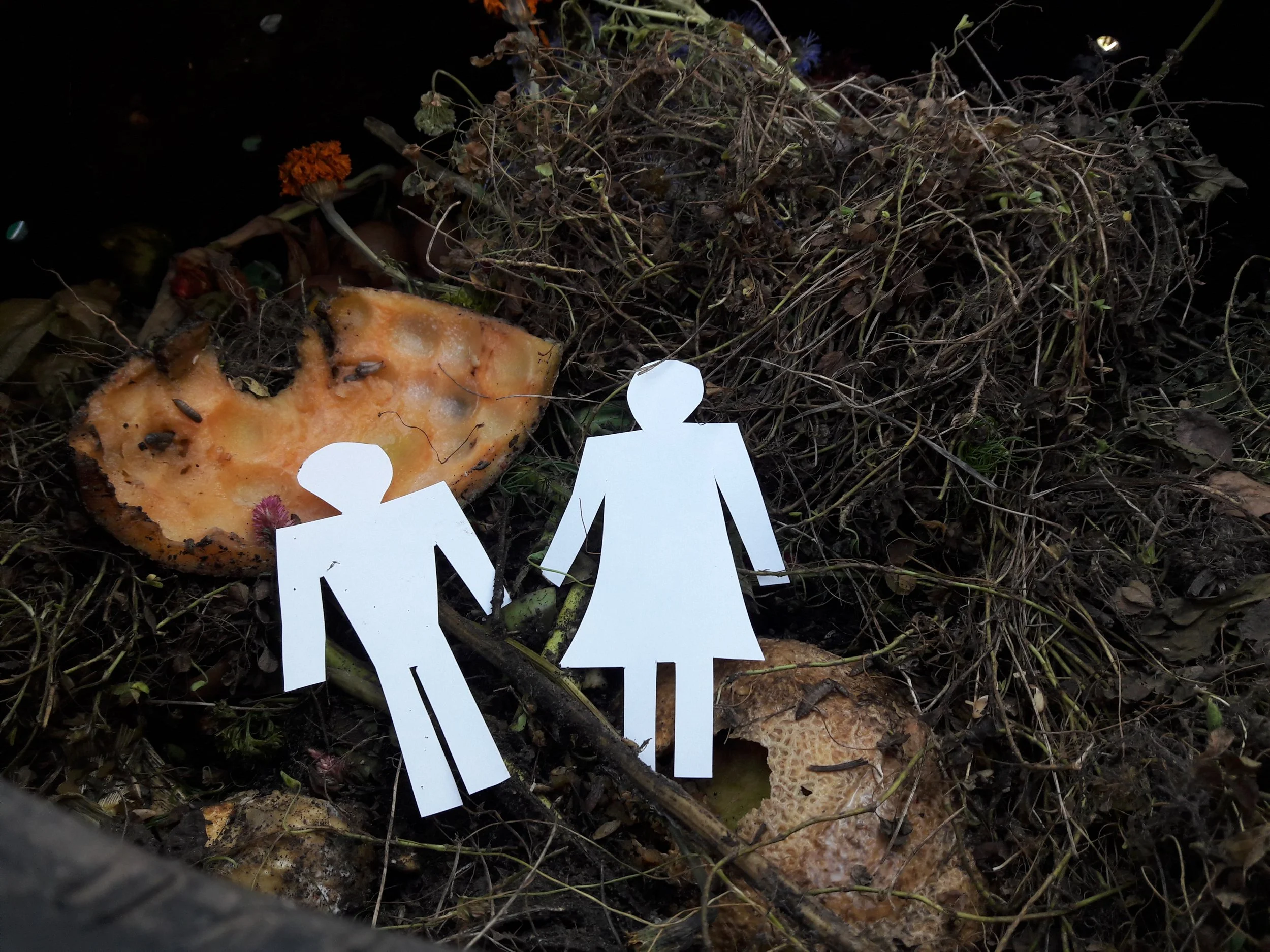 An image of my compost heap. Two white paper-cut figures representing the gender binary, similar to those found on restroom signs, are on top.
