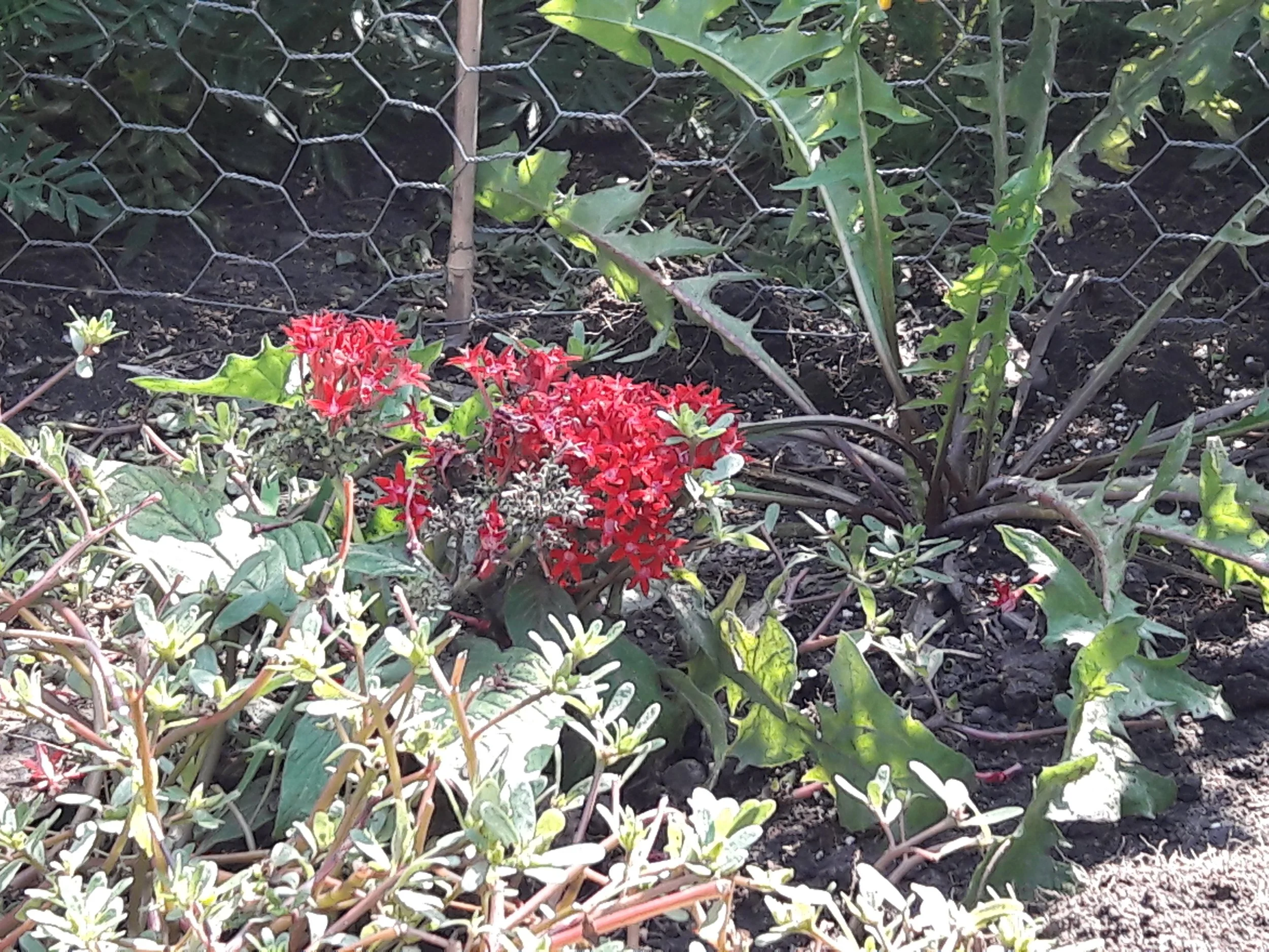 Red perennial flower Pentas, surrounded by dandelion, purslane, and spotted spurge, excellent soil rehabilitators and medicines- aka “weeds”
